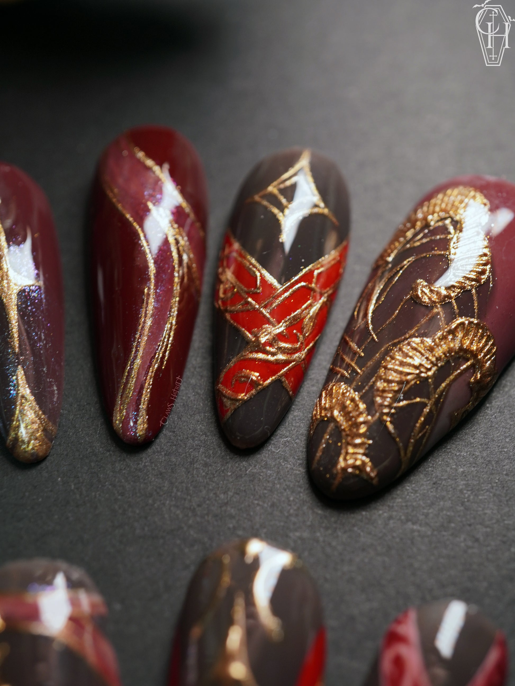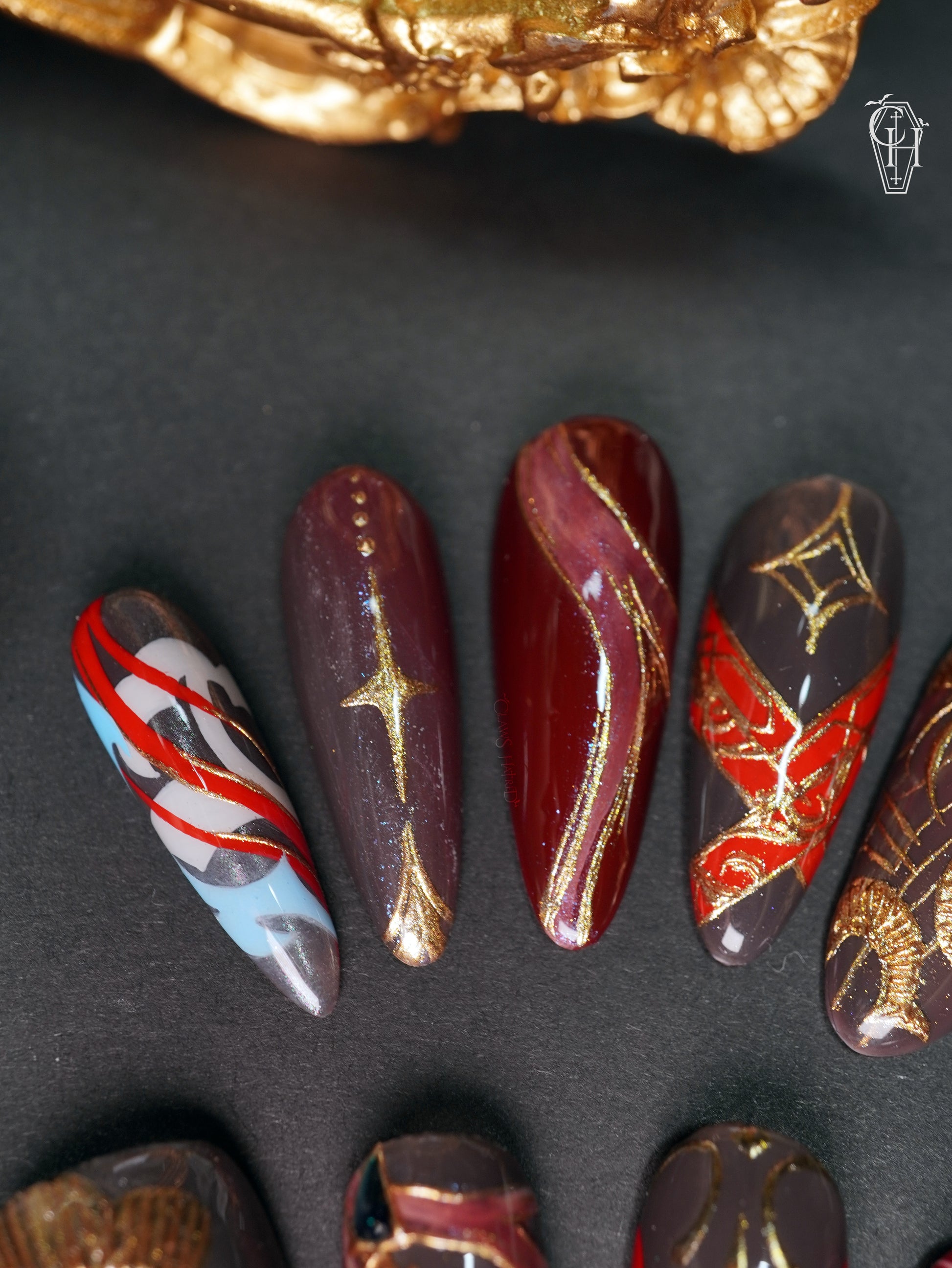 Inspired by Zayne's second myth, Obsidian Clouds features deep shades of red on charcoal and threads of gold throughout; with swooping details, textured beaded chains, and delicate layers with intricate scrollwork, this set pays homage to our Master of Fate and MC's paired outfit 🎍