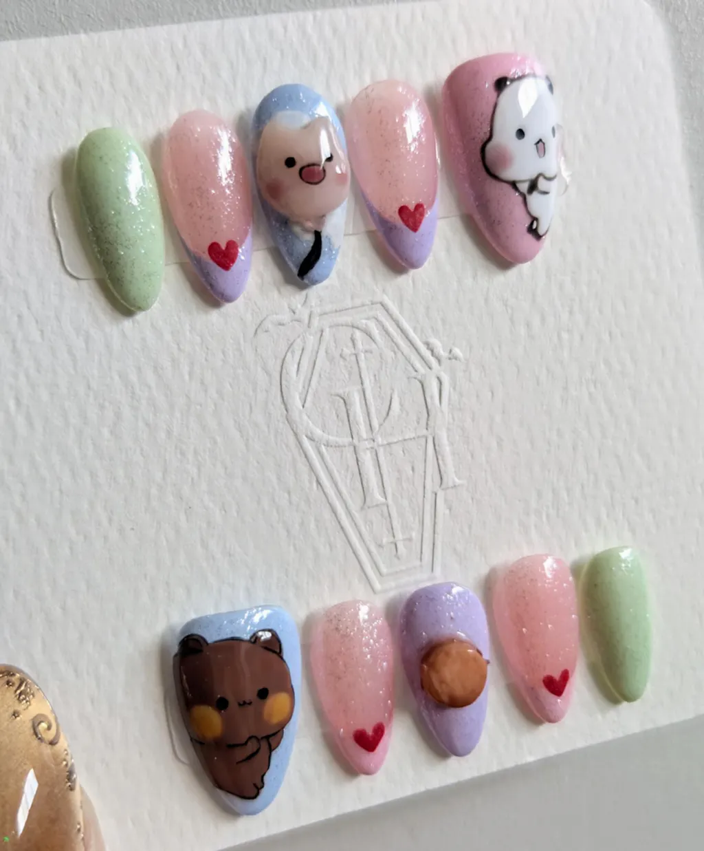 I love my customs so much! They are exactly what I was hoping for and then some. The details are incredible, they're easy to put on, fit perfectly, and feel natural. I cannot overstate how much I adore these nails. They're literally made for me - literally - and it shows.