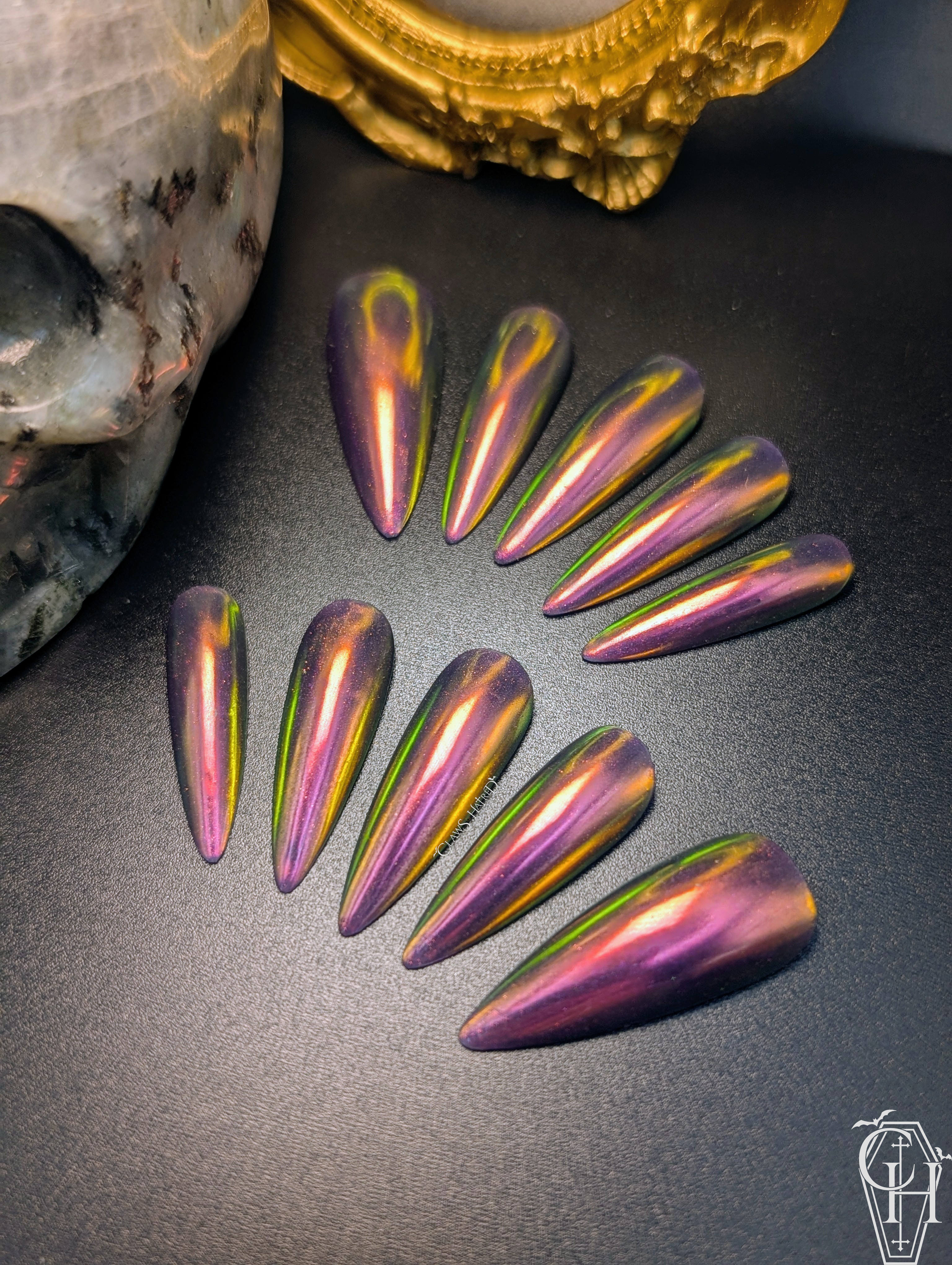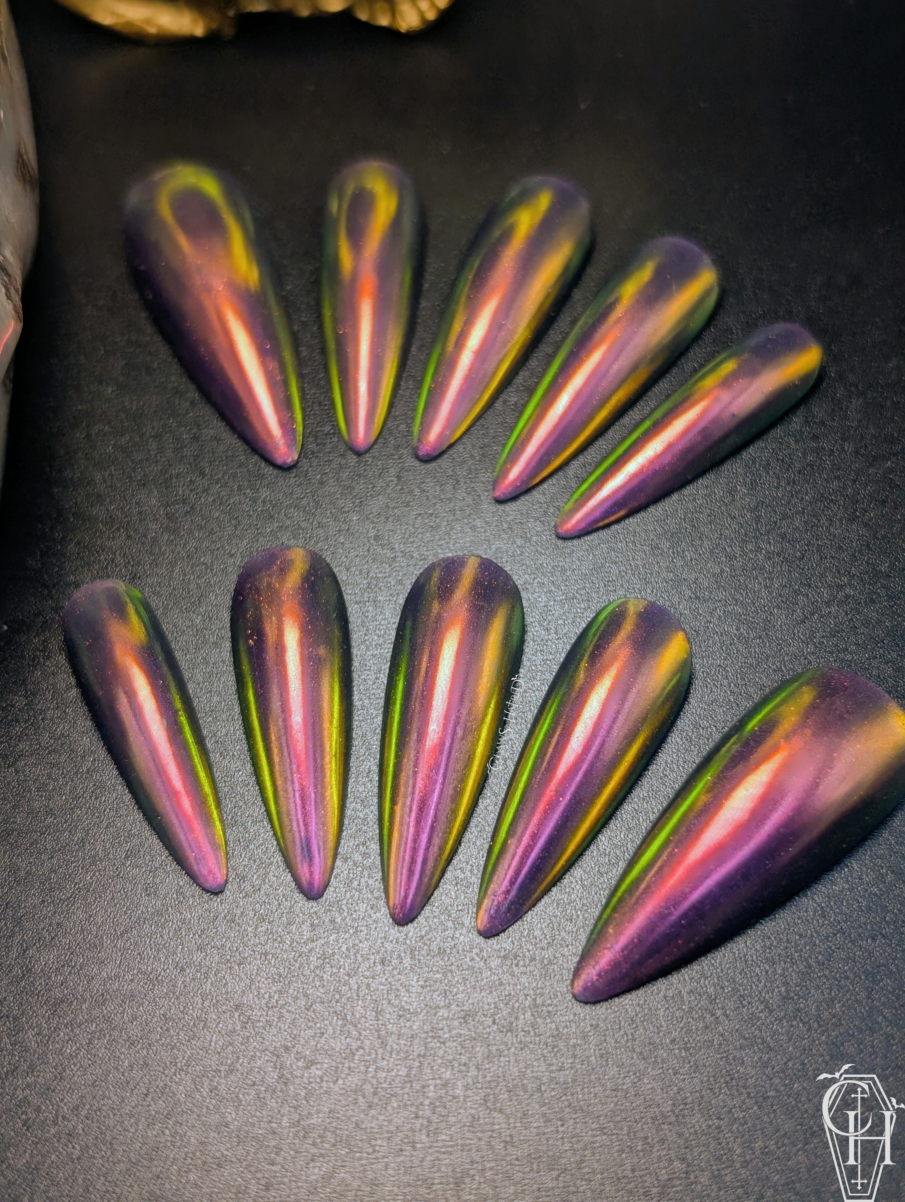 A striking purple base with subtle fuchsia shimmer, complete with a fire red/orange iridescent chrome top, “The Lisa” will be catching everyone’s eyes while you’re out and about!